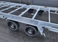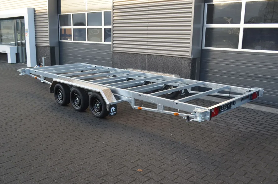 En kraftig treaxlad trailer anpassad för transport av 20-fots container med personbil. Försedd med containerlås. Tre hjulaxlar som klarar 1350 kg/axel.